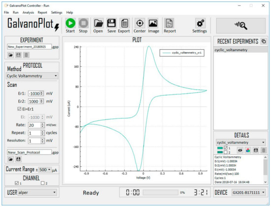 The user interface was written in C++ by using the QT framework for desktop computers, and it was designed by GalvanoPlot (İzmir, Turkey). A virtual COM port was created for the USB communication between the computer and MCU. An example experiment window for the CV is shown in