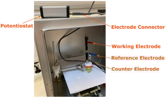 DPV measurements were undertaken in a Faraday cage using both the developed instrument and the Autolab PGSTAT-302 electroanalysis system as a commercial potentiostat. All measurements were performed with a traditional three-electrode system using a disposable pencil-graphite electrode, a platinum wire, and an Ag/AgCl/KCl/3M (BAS, Model RE-5B, W. Lafayette, IN, USA) as the working, counter, and reference electrodes, respectively. The experimental setup containing an electrochemical cell and three-electrode system in combination with the developed instrument is given in