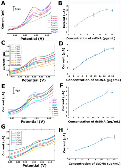 Figure 6B,D,F,H) representing the average guanine oxidation signals related to the ssDNA or dsDNA-immobilized PGEs in the case of different DNA concentrations were used to observe the relationship between the DNA concentration and current. The current is proportionally increased in the case of an increased DNA concentration until the PGE surface is saturated.