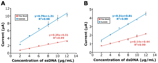 Figure 7A). Conversely, when using the Autolab PGSTAT-302, there was a proportional increase observed at the current over a concentration range of ssDNA from 2 to 12 µg/mL (