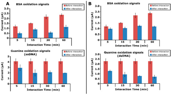 31]. This phenomenon could be explained as more BSA interaction with ss/dsDNA occurring over longer durations. The highest decrease percentage was obtained with the surface-confined interaction performed for 60 min.