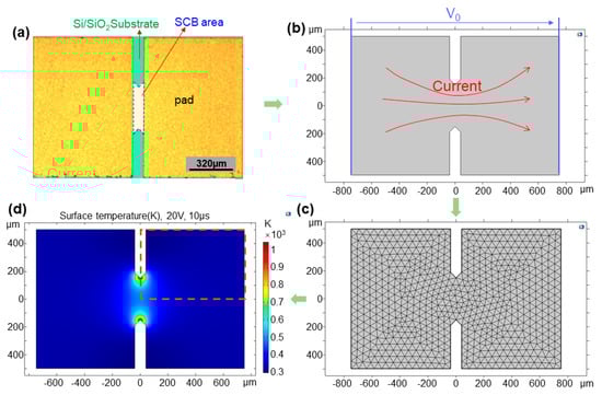 (a) Photograph of the SCB initiator, the SCB area is 380 µm × 80 µm with Au/Ti pad on both sides, (b) 2D physical simulation of SCBs, a voltage is applied on SCB, (c) the finite element mesh division, (d) typical surface temperature simulation result of SCBs.