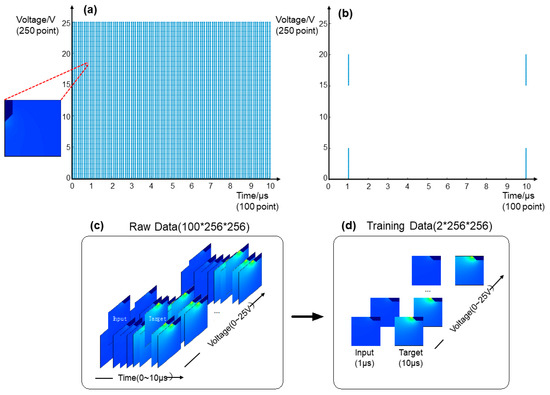 (a) A schematic of the raw dataset of a simulation result. The dataset contained 250 voltage results with 100 temperature distributions at different times per voltage (b) A schematic of training data of simulation result, 100 data at 1 μs as input data, and another 100 data at 10 μs as target data (c) surface temperature distribution of raw data, (d) surface temperature distribution of training data.