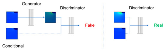 CNN trained with MSE (mean squared error) loss tends to smooth the output. Since this application requires high numerical accuracy, we consider the smoothing effect a compromise to model performance. To alleviate this issue, we built a conditional variant of generating an adversarial network (GAN) on top of the CNN backbones to capture the nuanced variations during the heat process. As shown in Figure 3, conditional GAN consists of a generator network (G) that produces an element-wise temperature distribution from a conditioned variable, the input SCB temperature distribution. A discriminator network (D) also takes the conditional and distinguishes the actual distributions from the generated distributions. They reach an equilibrium by constructing G and D to optimize a minimax loss function [20]. Conditioned G learns the distribution characteristics based on the conditional in the game process. Thus, given a conditional input, G captures the distribution of actual data samples and generates new data samples.