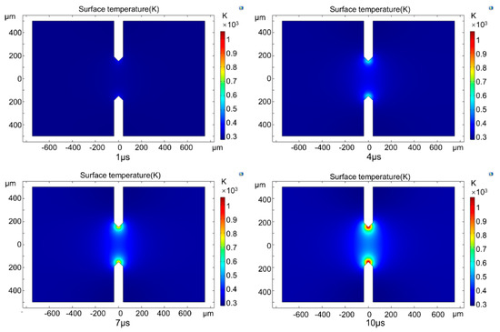 To research the heating process of SCBs, the typical surface temperature of SCBs simulated with COMSOL was analyzed. The surface temperature distribution of SCBs at 1 μs, 4 μs, 7 μs, and 10 μs under 20 V is shown in Figure 4, and the heating process is shown in Video S1. The temperature of the double V-shaped SCB raised fastest at the edge of the sharp V-shaped corner (Figure 4). Temperature increases slowly for regions that are further away from the V-shaped corner. The highest temperature was first observed at the edge of the sharp V-shaped corner. Then, along the direction of the narrowest part of the SCB, the hot spot spread from both ends to the middle. The hot spot extends from the narrowest point to both ends in the width dimension. Because of the sharp V-shaped corners, the current density was the highest at the sharp V-shaped corners. Therefore, it was easier to generate hot spots at sharp corners in SCB. This is consistent with our previous result that the sharp V-shaped corner has the largest electric explosion area [23,24].
