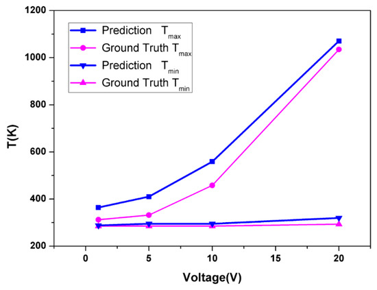 Comparison of predicted and calculated values of maximum and minimum temperatures at different voltages.