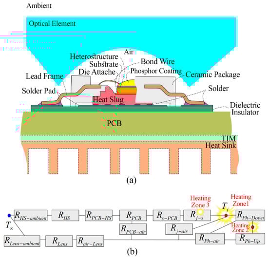 LEDs (along with all other power semiconductor devices) act as discrete heat sources, dissipating heat through electronic packages into printed circuit boards (PCBs) and heat sinks. Currently, in optimum current densities of LEDs, around 70% of the input electrical power converts into heat generation [18]. Figure 1a schematically shows the structure of a sample lead frame with a metal/plastic body package [19]. As shown in Figure 1b, the primary cause of the temperature rise in LEDs is the stacked thermal resistance barriers in their complex thermal architecture [20,21]. Junction temperature (Tj) is the largest recommended operating temperature in an electronic structure, which is shown in the thermal resistance network in Figure 1b. As indicated by the heat generating zones (1 to 3) in the thermal resistance map of a typical LED in Figure 1b, heat is being generated in an LED at (1) the active region due to non-radiative recombination, inside of the optical cavity due to radiation absorption, electrical structures and semiconductor metal interfaces due to Joule heating [22], (2) phosphor–polymer composite/coating in a white LED due to Stokes shift and thermal quenching of phosphor [23,24,25,26,27], and (3) outside of the optical cavity due to the radiation absorption and other electrical structures due Joule heating [28,29]. Currently, chip on board, wafer level, and chip-scale packaging are the most popular designs in the LED market for heat dissipation [30]. In the past three decades, the thermal resistance of the packages has reduced from 8 K/W [31] in 2008 to 5 K/W [32] in 2016 and now to 3.5 K/W [33].