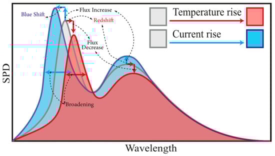 The TSOPs are unique for each electrical working condition, and light output changes depending on the internal quantum efficiency and band gap characteristics of an LED at each specific temperature and input current [69]. A summarized illustration of the SPD response to temperature and input current induced changes of an arbitrary white LED (WLED) is shown in Figure 2.