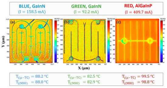 Recently, TSOP-based temperature measurement methods have extended to two-dimensional (2D) thermal mapping. Based on new microscopic hyperspectral imaging (MHI), the 2D spectral power distribution can be obtained from light emitting surfaces and can be used to incorporate the TSOP for surface temperature measurement of the LEDs. Jin et al. [89] used the MHI-based centroid wavelength method to study the 2D temperature distribution of the blue, green, and red LEDs (see Figure 3). After calibration of the centroid wavelength coefficient, the authors reached as low as 3 μm resolution for the surface temperature measurement of the LEDs, which is claimed to be capable of reaching submicron level accuracy.