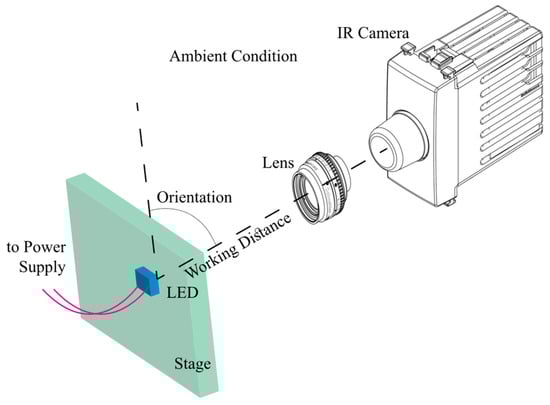 IR thermal imaging is a real-time imaging method for measuring temperature distributions [103]. The application of IR thermography can be seen for the thermal inspection of various types of LEDs, including chip on board (COB) [104], surface mounted devices (SMD) [105], and flip-chips [106]. This method is widely preferred for various thermal management-related problems in LEDs [107,108,109,110,111,112]. The basic principle of IR thermography is to capture electromagnetic radiation emitted from the surface of objects in the IR spectrum and monitor the corresponding 2D temperature maps. Currently, commercially available IR imaging systems can offer temperature sensitivity within 0.1–1 K and temporal accuracy of 100 μs [113]. Although the IR region of the spectrum extends up to 100 μm, due to the sensitivity reduction above 20 μm, only the 0.7–20 μm range is used for temperature measurements [53]. A typical experimental arrangement and measurement apparatus for IR thermography is illustrated in Figure 4. The setup essentially consists of a lens with a known working distance to focus the thermal radiation on the camera’s detector. Based on the orientation of the LED and ambient conditions, for each setup position, an adjustable emissivity setting should be used to calibrate the detector.