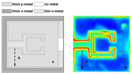 Recently, Zheng et al. [145] employed the thermoreflectance method to study the surface temperature of lateral-type blue LED chips (see Figure 7). In their measurements, a reflectivity change of the golden metal electrode was recorded, and it was observed that the thickness of the electrode was sufficiently thick to hide unwanted reflections from the underlying materials. For the thermoreflectance experiments, an incident probe laser beam with a spot surface of 3 μm was used. As a result, good agreement between the thermocouple, FVM, and thermoreflectance methods was observed in the Tj range of 75 °C. However, discrepancies between the different methods were seen at higher temperatures, where FVM showed obvious higher values. The authors stated that this difference is due to the self-heating and finite thermal resistance between the Tj and measured surface points. It should be mentioned that as Tj increases, significant heat flux from the surface to the ambient due to a higher transfer coefficient can be expected [146], which can result in the underestimation of the surface thermography of LEDs.