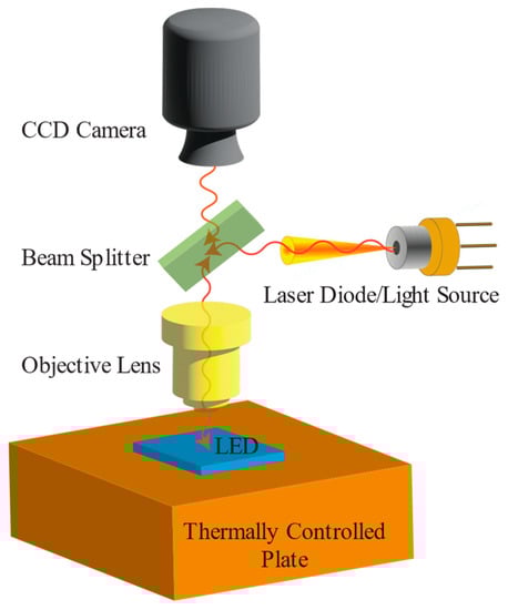 - Summers, J.A.; Hudgings, J.A. Confocal Thermoreflectance for Spatially Resolved Surface Thermography of Transparent LEDs. In Proceedings of the 2009 Conference on Lasers and Electro-Optics and 2009 Conference on Quantum electronics and Laser Science Conference, Baltimore, MD, USA, 31 May–5 June 2009; pp. 1–2. [Google Scholar]