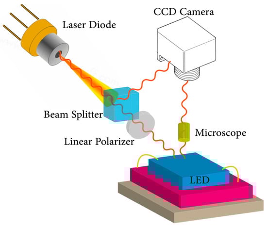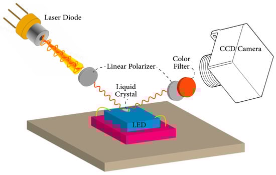 A schematic of the experimental arrangement of the liquid crystal thermography technique. The test setup is typically composed of a polarized laser beam, a charge-coupled camera with a color filter, and liquid crystal coated over the LED surface.