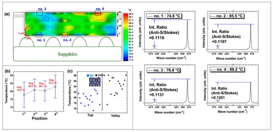(a) Temperature distribution in the x-z cross-section obtained from Stokes and anti-Stokes intensity ratio evaluations. Extreme Raman spectra points are shown from no: 1-4. LED Tj is assumed to be the same as the top surface temperature. (b) Average temperatures at different locations. (c) Scatter temperature plot of 32 different positions at top and valley sites. Reprinted/adapted with permission from Ref. [163]. Copyright 2018, American Physical Society.