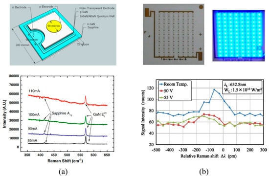Literature examples for the usage of Raman Spectroscopy for Tj unpackaged UV LED and blue LED are given in Figure 10a,b while a parametric summary of Raman Spectroscopy studies is provided in Table 3.