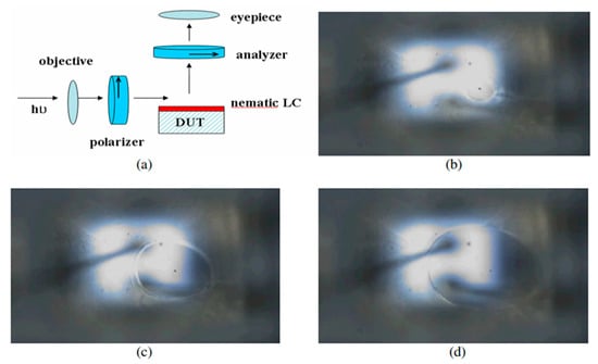 Lee and Park [175] were among the first to use nematic crystal thermography for temperature measurement of visible LEDs. Liquid crystals with transition temperatures of 302, 313, 331, 356, and 380 K were applied over the LED chip, and a red filter was used to reduce the LED’s optical power, which can otherwise overwhelm the reflected light from the chip. A high power 660 nm laser beam was used as the illumination source since the chip is transparent to this wavelength, and it was ensured that the laser beam did not heat up the device. Due to the blockage of LED light, the authors suggested the use of a transparent high-power laser for accurate spatial temperature measurements. Although the black and bright appearance of the liquid crystal was used to assess the temperature of the LED device, and the authors were able to reach 21 and 35 μm resolutions, measurements were limited by the transition temperatures of the liquid crystals. In a similar procedure, Hwang et al. [176] used the liquid crystal thermography technique to observe local hot spot zones in GaN-based blue LED chips with a size of 330 × 330 µm2. For the measurements, a liquid crystal with a 29 °C anisotropic–isotropic transition temperature was used, and localized hot spots of 80 and 400 µm size were observed (See Figure 12).