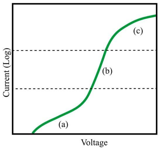 FVM exploits the temperature dependence of the forward biased diode’s voltage by passing a constant current through the LED and monitoring voltage flow across the diode. A typical forward current-voltage characteristic of an LED is represented in Figure 13. The plotted current–voltage curve is comprised of three regions. The low-current section (see region (a) in Figure 13) represents the region where current–voltage behavior is dominated by the trap-assisted tunneling or defect-assisted carrier leakages (Perlin et al. [183] broadly discussed the dominancy of carrier transport by tunneling across the active region, and readers can refer to their study for more information about the topic). As the voltage increases, an exponential increase in current can be observed (see region (b) in Figure 13), which is dominated by radiative recombination. Finally, when the voltage exceeds a certain limit (e.g., 2.5 V for blue LEDs), deviation from exponential behavior is observed (see region (c) in Figure 13) due to the increased role of ohmic series resistance.
