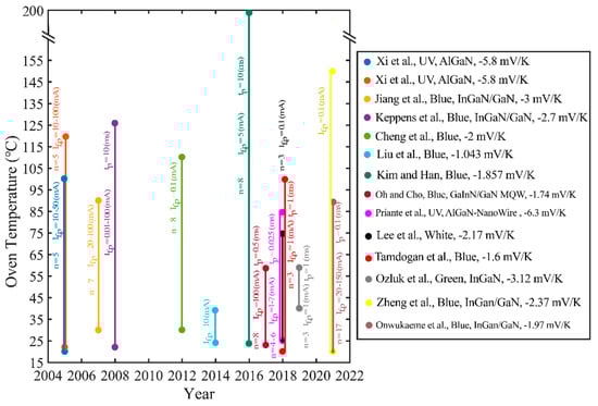 Figure 14 compares experimental parameters from different research groups that performed FVM calibrations in a concise manner. As shown in Figure 14, a wide range of pulse current (If,n) values were reported, while only a few authors provided pulse duration (tp,n) values. It can be seen that, in general, only a few pulses are performed, and the value of “n” rarely exceeds 10. This issue arises from hardship and the time-consuming process of achieving a thermal equilibrium condition. Initial temperatures are mostly adapted near the room temperature; however, consistency in the value of maximum temperature cannot be seen. Interestingly, these inconsistencies in experimental parameters have shown their effect on the behavior of voltage–temperature, which can be seen in more detail in Table 4, where experimental measurement parameters employed in various FVM-based LED thermal characterization studies are summarized.