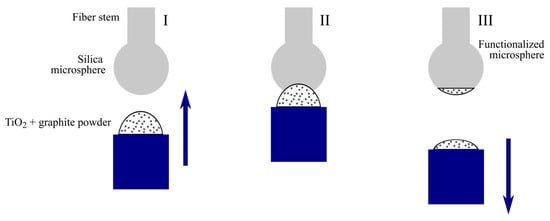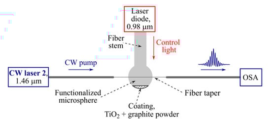 Next, the produced microsphere was functionalized by a coating made of titanium dioxide TiO2 powder in silicone grease mixed with graphite powder. Graphite powder efficiently absorbs and thermalizes near infrared light; TiO2 in a silicone grease is a basis with a high thermal conductivity. This coating was precisely applied near the microsphere pole opposite to the fiber stem. The controlling light at 0.98 µm was coupled into the microsphere through the fiber stem and then its thermalization occurred near the pole in the coating. The purpose of the coating was effective thermalization of the radiation of the auxiliary laser diode for thermo-optical control of pump detuning from the exact resonance due to thermo-optical shifts of WGM frequencies. The process of microsphere coating is depicted in Figure 1. The diameter of the coated area was about 40 µm. This coating is located sufficiently far from the WGM region and does not affect Q-factor, FSR, or dispersion.