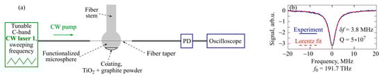 The Q-factors of the produced functionalized microspheres were measured according to the scheme in Figure 2a. We used a narrow-band pump laser (CW laser 1) with a linewidth of 10 kHz, whose frequency was swept at a rate of 15 GHz/s with an amplitude of 60 GHz around the center frequency f0 = 191.7 THz (~1.56 µm). The laser radiation was launched into the functionalized microspheres using a silica fiber taper with a waist diameter of about 2 µm. The resonances were measured using an oscilloscope. A typical resonance curve with a width of 3.8 MHz corresponding to a loaded Q-factor of 5 × 107 is shown in Figure 2b. Note that microspheres without coating have very similar Q-factors. So, the coating indeed does not affect the Q-factor, since it is far from the equator near which WGMs propagate.