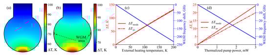 First of all, we theoretically investigated the possibilities of thermo-optical control of WGM frequencies using coating and an auxiliary laser diode. An example of the simulated temperature field at ΔTcoating = 100 K is given in Figure 3a. Figure 3b shows an example of the simulated temperature field when, in addition to thermalization of diode radiation in the coating, pump radiation with power Pmode = 2 mW in the WGM area is partially thermalized. We calculated the temperature increase averaged over the whole microsphere (ΔTav), temperature increase averaged over the WGM area (ΔTmode), and the corresponding WGM frequency shifts as functions of external heating ΔTcoating (Figure 3c). We also checked that for simultaneous heating at the pole by a laser diode and heating in the mode area by a pump laser, the temperature increase is almost additive ΔT(Pmode, ΔTcoating) ≈ ΔT(Pmode = 0, ΔTcoating) + ΔT(Pmode, ΔTcoating = 0); the maximum discrepancy is ~2%. The calculated averaged temperature increases ΔTmode and ΔTav as well as WGM frequency shifts as functions of Pmode for ΔTcoating = 0 are plotted in Figure 3d. So, the thermo-optical shifts of WGMs can be comparable with FSR for reasonable experimental parameters and provide great opportunities for controlling detuning. As expected, the influence of heating in the coating is higher than in the mode.