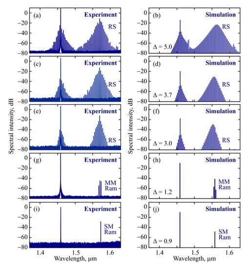 Experimentally measured (left column) and numerically simulated (right column) spectra demonstrating Raman soliton (RS) generation (a–f), multimode Raman (MM Ram) generation (g,h), and single-mode Raman (SM Ram) generation (i,j). Compare pairs (a–j). Pump power at 1.46 µm is constant 12 mW (before the taper) and power of 0.98 µm auxiliary laser diode is attenuated from 200 mW (at the beginning of the experiment, when there is no Raman generation) to: 80 mW (a), 65 mW (c), 50 mW (e), 20 mW (g), and 0 mW (i).