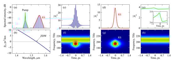 Next, we performed a more detailed theoretical analysis of the generated Raman solitons. We considered a typical example of an optical frequency comb with the spectrum shown in Figure 7a (simulated with P = 30 and Δ = 3.7). The calculated microsphere dispersion is plotted in Figure 7b. The microsphere was pumped in the normal dispersion region, and the Raman soliton was generated in the anomalous dispersion region. The spectral intensity envelope of the Raman soliton is shown in Figure 7a by the red curve, and the spectral intensity envelope of the weak comb near the pump is shown in the same figure by the green curve. The temporal intensity profile of the total signal is plotted in Figure 7c. The temporal structures of the Raman soliton and the signal near the pump are demonstrated in Figure 7d,e, respectively. The spectrograms for the total signal, the Raman soliton, and near-pump radiation are presented in Figure 7f–h, respectively. To construct them, we used a window function in the form W = exp[−τ2/(40 fs)2]. The spectrogram in Figure 7f demonstrates that the soliton has an ideal shape and a flat phase, like the ideal soliton in the classical nonlinear Schrödinger equation []. The temporal intensity profile of the signal near the pump does not depend on slow time. Note that the Raman soliton and the pump wave shown in Figure 7c are not phase-locked. The fringes “roll” during the evolution. The Raman soliton also affects the near-pump signal and helps to hold the temporal structure in Figure 7e through cross-phase modulation. We confirmed this fact in modeling by artificially adding high loss at wavelengths longer than 1.52 µm, which led to Raman soliton suppression and destruction of the near-pump weak comb.
