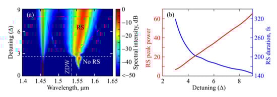 Finally, we numerically considered different values of detuning and simulated the comb spectra as a function of Δ at a constant dimensionless pump power P = 30 (Figure 8a). It was found that stable Raman solitons can form only within a certain detuning range of about 2.7 < Δ < 9. At low detuning values (0.7 < Δ < 2.7), mode locking does not occur, but single-mode or multi-mode Raman generation can be observed, which agrees with the experimental data (see Figure 5g–j). When Δ < 0.7, only CW intracavity radiation at the pump wavelength is observed. The explanation is very simple. It is well known that in the CW regime the intracavity power depends on Δ, while with a gradual increase in Δ, the intracavity power increases (until Δ < P) [,]. At a certain value of Δ ≈ 0.7, the threshold of Raman generation is reached. When the threshold is slightly exceeded, the Raman generation is single-mode (compare Figure 5g,h). As Δ is increasing with a noticeable excess of the intracavity power relative to the threshold, multimode Raman generation develops, but the total power in different harmonics is insufficient to form a soliton (the harmonics are not mode-locked). With a still higher increase in Δ > 2.7, the intracavity power at the pump frequency reaches values at which the generated power in the Raman harmonics is sufficient to form a soliton. Further, as the detuning increases, the peak power PRS of the Raman soliton increases, the spectrum broadens, and its FWHM (full width at half maximum) duration TRS decreases (Figure 8b). In this case, the central wavelength of the soliton λRS slightly increases (Figure 8a), which is explained by the Raman amplification of low-frequency harmonics by higher-frequency harmonics. Note that a similar effect is also known for dissipative Kerr solitons formed near the pump frequency, when the central soliton frequency shifts to longer wavelengths relative to the pump with increasing detuning due to non-zero Raman gain at low frequencies [,]. We verified that our solitons satisfy the condition γ⸱PRS·(TRS/1.763)2/|B2(λRS)| ≈ 1 like for classical solitons in the nonlinear Schrödinger equation []. In our system, the round-trip losses are completely compensated by the Raman gain for the Raman soliton. When the detuning Δ ≈ 9 is reached, the Raman soliton begins to exhibit breather behavior, which requires a separate study and is beyond the scope of this work.