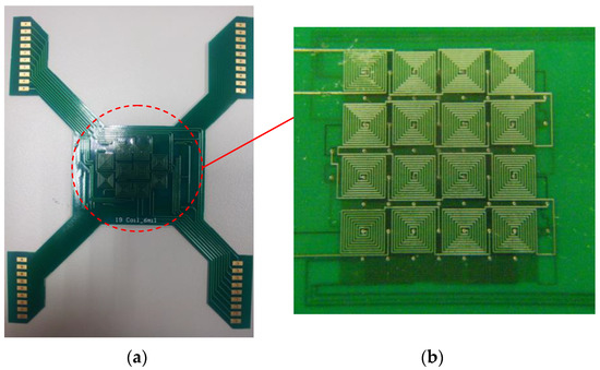 (a) Photograph of the magnetic-actuated chip. (b) Two-layer 4 × 4 array micro-coils of the PCB layout on the upper and bottom layers.