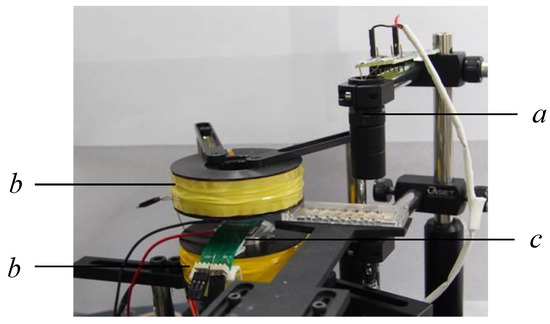 Experimental setup of the magnetically actuated platform. a: digital camera attached with a CCD; b: Helmholtz coil; c: magnetically actuated chip.