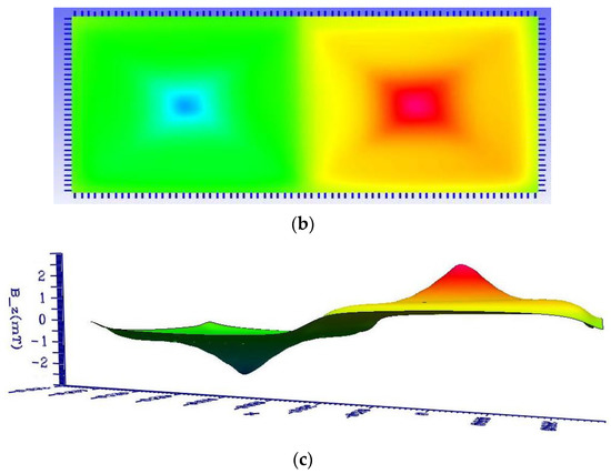 Figure 4a shows the simulated geometries of two micro-coils. The dimensions of an 8-winding micro-coil are listed in Table 2. Two different directions of DCs were separately applied to each of the coil centers. The 2D and 3D contours of the magnetic field were numerically demonstrated as shown in Figure 4b,c, respectively. Considering the application of a DC of 1.0 A in different directions, the 2D or 3D profiles of the z-axis magnetic field were symmetrical to the wave-shaped surfaces. The maximum value was numerically obtained as 2.84 mT at a DC of 1.0 A.