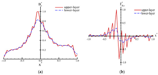Numerical profiles of the dimensionless (a) B*Z and (b) F*B,X varied along with x*.