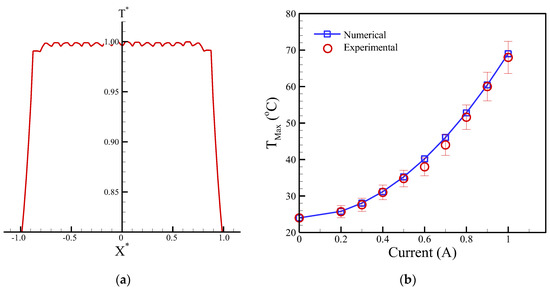 (a) Numerical profiles of T* varied along with the dimensionless distance of x*. (b) Numerical and experimental comparison of maximum temperature (TMax) versus different applied currents.