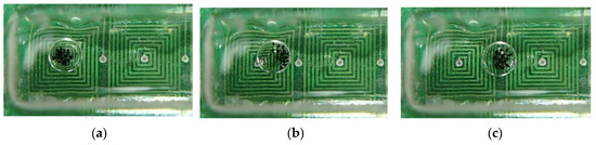 A droplet containing the clustered magnetic beads, which is located at the center of an upper-layer micro-coil as indicated in Figure 9a. Afterward, a constant electric current was applied at the lower layer of a micro-coil to generate the magnetic field. The clustered magnetic beads were then induced to move the front rim of a droplet as shown in Figure 9b, thus facilitating the movement of the droplet to the center of a micro-coil (Figure 9c). The moving time is experimentally measured in the movement process. The motion distance, that is, half a width of the micro-coil (lx = 3.0 mm), was then divided by the moving time to convert the moving speed of a droplet.