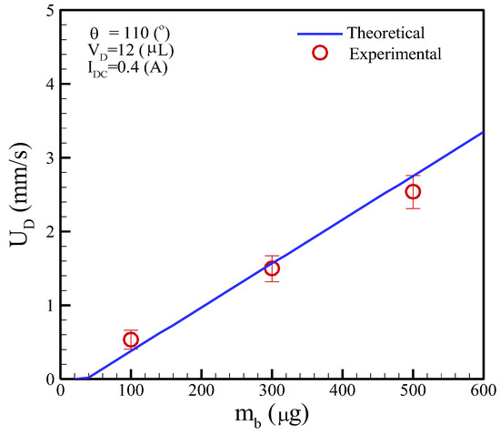 Equation (11) is used to predict the moving speed of a droplet containing clustered magnetic beads. The parameters included the loading mass of the clustered magnetic beads, droplet volumes, and applied DC currents. The electric properties of materials are listed in Table 3. Figure 10 shows the moving speed of a droplet considering the mass of magnetic beads at a constant droplet volume of 12 μL and an applied current of 0.4 A. This figure indicates that the loading mass of magnetic beads must exceed “the threshold mass” to actuate the droplets for the given droplet volume. In principle, the “loading mass” is too small (i.e., mb < 60 μg) to actuate the droplet movement. Moreover, the droplet moving speed linearly increased with the rising loading mass of magnetic beads for the theoretical analysis and experimental data.