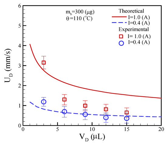The mass of the clustered magnetic beads is maintained at mb = 300 μg with the application of two different DC currents and the current magnitudes are 0.4 and 1.0 A. The volumes of a droplet were pipetted to be 3.0, 6.0, 9.0, 12.0, and 15.0 μL. The experimental results revealed that the movement speeds are inversely proportional to the droplet volumes for a constant DC. As expected, a small droplet volume and high DC can achieve a fast moving speed. On the contrary, a large droplet volume and low DC could lead to a slow movement speed. The theoretical analysis of moving speed, that is, the formula of Equation (11), was also compared with the experimental measurements as shown in Figure 11. The prediction results are in reasonable agreement with the measurements at a low DC of 0.4 A. However, the prediction results are substantially higher than the experiments at a high DC of 1.0 A. This phenomenon is due to the thermal effect, which was dissipated at a high electric current. Therefore, the theoretical analysis of a droplet moving speed can be used for predictions at a DC of 0.4 A while the thermal dissipation is neglected.