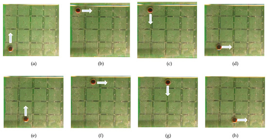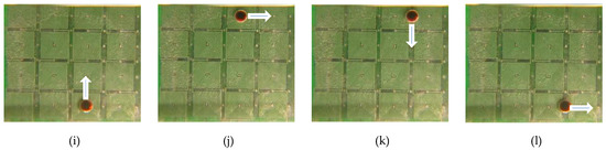 Finally, a liquid droplet was tested to facilitate transportation on an open surface by the proposed micro-coil chip. To reduce movement resistance, silicon oil was uniformly distributed on the PCB surface. The operating condition is as follows: mb = 300 ug, VD = 12.0 uL, and I = 1.0 A. Every adjacent micro-coil turns on/off by switching a frequency of 0.5 s. Figure 12 shows a series of photographs to perform the transportation of a droplet. A droplet containing the clustered magnetic beads was smoothly and continuously transported by a two-layer 4 × 4 array micro-coil chip. These results verified that the digital microfluidic chip could be used for transportation applications. In the current prototype, magnetically actuated chips are capable of transporting droplets either vertically or horizontally. The proposed system, however, does not implement curved trajectory functions. The sequence of a full cycle is displayed in Supplementary Video S1.