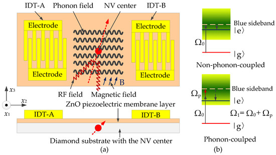 A negatively charged NV center is selected in this paper, which contains six electrons, two from nitrogen atoms, three from carbon atoms adjacent to the vacancy, and one trapped electron. The structural model of the phonon piezoelectric device of the NV center design is shown in Figure 1a, including an interdigital transducer (IDT) layer, a ZnO piezoelectric membrane layer, and a diamond substrate. The ZnO piezoelectric membrane is grown on the surface of the diamond. IDT is deposited on the surface of the ZnO piezoelectric membrane layer with the phonon-coupled manipulation method, multiphysics fields such as magnetic field, radiofrequency (RF) field, microwave, and laser perform resonant coupling regulation of the NV center. Phonon-coupled manipulation mechanism of the NV center is shown in Figure 1b. The blue sideband transition is manipulated by the phonon coupling of the phonon field-driven system from state to state in the presence of a phonon-containing field. This system is equivalent to a spin transition between two lower state phonon ladders, where is the phonon equivalent Larmor frequency, is the actual Larmor frequency, and is the effective Larmor frequency. The frequency of the laser is in a normal distribution interval (as shown in the green area in Figure 1b). For the non-phonon-coupled case, photons with wavelengths of 532 nm (whose corresponding actual Larmor frequency is ) can achieve excitation of the NV center. For the phonon-coupled case, photons with a wavelength of more than 532 nm (whose corresponding actual Larmor frequency is ) can achieve excitation of the NV center. More photons transition from the ground state to the excited state for the phonon-coupled case.