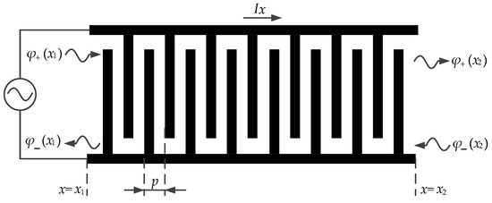 The IDT structure model of the phonon piezoelectric device of the NV center is shown in Figure 2. The characteristic function of the phonon field according to the Bragg reflection equation is as follows [36]: