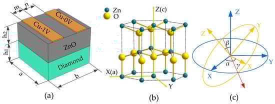 In this section, the finite element method is used to analyze the structural unit of the phonon piezoelectric device. The structural unit model of the phonon piezoelectric device of the NV center is shown in Figure 3a, which consists of an IDT unit layer, a ZnO piezoelectric membrane unit layer, and a diamond substrate unit. Structural unit parameters are set as follows: the IDT period λ is set as 0.5 μm; the IDT electrode width m is set as 0.25 μm; the IDT electrode thickness is set as 0.02 μm; the IDT interdigital width n is set as 0.25 μm; the diamond thickness h1 is set as 0.4 μm; the ZnO piezoelectric membrane thickness h2 is set as 0.4 μm. The piezoelectric membrane unit layer’s crystal structure of ZnO is shown in Figure 3b. The crystal orientation can be changed by setting the Euler angles (α, β, γ) of the ZnO piezoelectric membrane layer by rotating the coordinate system (as shown in Figure 3c).