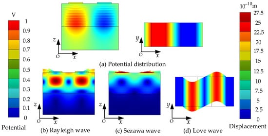 Potential, Rayleigh, Sezawa, and Love wave distribution of the phonon piezoelectric device. (a) Potential distribution; (b) Rayleigh wave distribution; (c) Sezawa wave distribution; (d) Love wave distribution.