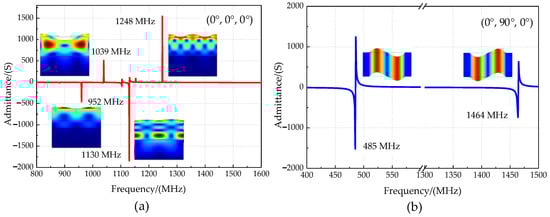 Admittance characteristics for different crystalline phonon device structural units. (a) (0°, 0°, 0°) ZnO; (b) (0°, 90°, 0°) ZnO.