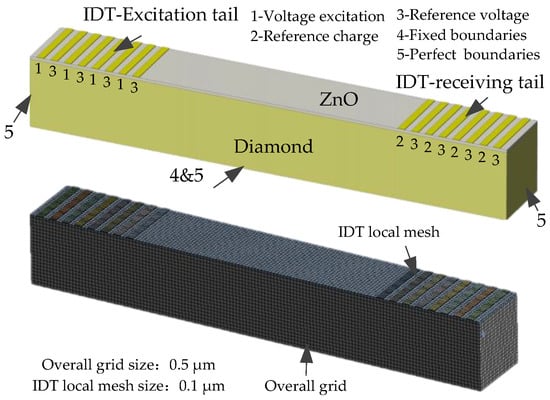 The acoustic field of the phonon piezoelectric device of the NV center was simulated at the frequency range of [600,1600] MHz. The material of the IDT is copper. The substrate material of the piezoelectric membrane layer is the ZnO crystal. The structural unit type is set as a hexahedral eight-node element. The geometric grid model and the mechanical and electrical boundary conditions of the phonon piezoelectric device of the NV center are shown in Figure 6. The mesh size of the phonon piezoelectric device is set to 0.5 μm. The electrode part is divided by the mapping grid. Five grid cells are scanned along the thickness direction of the IDT. Face 1 is the voltage excitation boundary condition. Face 2 is the reference charge boundary condition. Face 3 is the reference voltage boundary condition. Face 4 is the fixed boundary condition. Face 5 is the perfect boundary layer. Simulation structure parameters of the phonon piezoelectric device of the NV center are shown in Table 1.