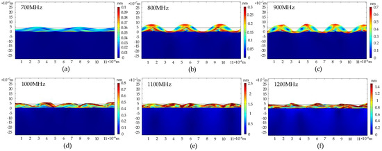 Phonograph displacement field in different resonant frequencies of the phonon piezoelectric device of the NV center. (a) 700 MHz; (b) 800 MHz; (c) 900 MHz; (d) 1000 MHz; (e) 1100 MHz; (f) 1200 MHz.