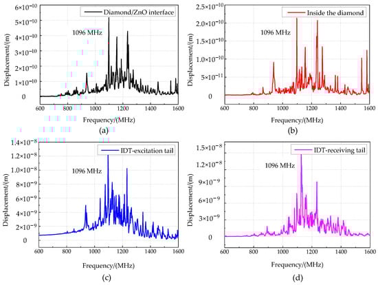 Relationship between displacement and frequency of the phonon piezoelectric device. (a) Diamond–ZnO interface; (b) inside the diamond; (c) IDT excitation tail; (d) IDT receiving tail.
