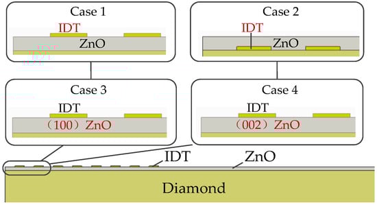 IDT electrode positions are optimized on the basis of the structural model of the phonon piezoelectric device in Section 3.1. Phonon piezoelectric devices with different electrode positions, including four cases (shown in Figure 9), were analyzed. In addition, the (100) ZnO with Euler angles of (0°, 0°, 0°) and the (002) ZnO with Euler angles of (0°, 90°, 0°), respectively, were analyzed. The specific description is as follows: Case 1: the IDT electrode is located on the ZnO piezoelectric membrane layer. Case 2: the IDT electrode is located between the diamond and the ZnO piezoelectric membrane layer. Case 3: the ZnO piezoelectric membrane material is (100) ZnO. Case 4: the ZnO piezoelectric membrane material is (002) ZnO. The IDT electrode (thickness of 0.1 μm) is located on the surface of the ZnO piezoelectric membrane in both Case 3 and Case 4. The material parameters of the phonon piezoelectric device of the NV center are shown in Table 2. The boundary conditions are the same as those in Section 3.1. The optimized parameters of the IDT electrode size used are shown in Table 3.