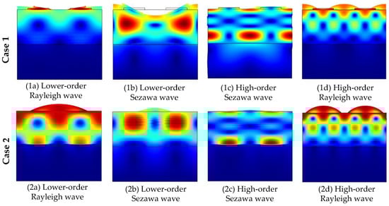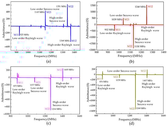 The acoustic characteristics of the phonon piezoelectric device are listed in Section 3.1. The phase velocity v and the electromechanical coupling coefficient K2 are analyzed in this section. The electrode input admittance characteristics of the phonon piezoelectric device of the NV center for different cases are analyzed, as shown in Figure 10. Four peaks can be observed, the first peak is the low-order mode (M11 mode) Rayleigh wave, the second peak is the low-order mode (M21 mode) Sezawa wave, and the third peak is the high-order mode (M22 mode) Sezawa wave, and the fourth peak is the high-order mode (M12 mode) Rayleigh wave. The modal waveforms for different cases are shown in Figure 11.