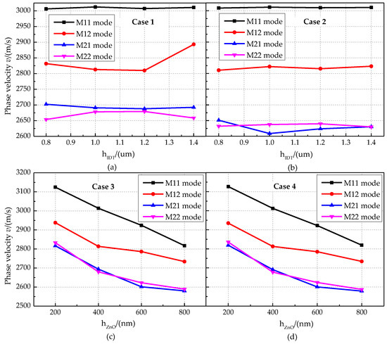 The relationship between the phase velocity characteristics and the thickness of the IDT layer for different cases is shown in Figure 12a,b. The phase velocities of the M11 mode and M12 mode of the phonon piezoelectric device are greater than those of the M21 mode and M22 mode. The phase velocity of the Sezawa wave mode is smaller when the IDT layer is located between the ZnO piezoelectric membrane and the diamond. The phase velocity characteristic curves for different thicknesses of the ZnO piezoelectric membrane layer and the Euler angle are shown in Figure 12c,d. In Case 3 and Case 4, the phase velocity of the phonon piezoelectric device decreases with the increase in the thickness of the ZnO piezoelectric membrane layer. The phase velocities in M11 mode and M12 mode are larger than those in M21 mode and M22 mode.