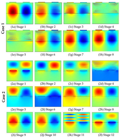 The potential oscillation period of the phonon piezoelectric device for Case 1 and Case 2 are shown in Figure 13. The potential of the structural unit of the phonon piezoelectric device changes periodically with the excitation frequency. The potential oscillation period is divided into eight stages, and a high-potential region and a low-potential region appear in Case 1. The potential in the first four stages gradually evolves from single mode to multimode, and the potential in the latter four stages gradually evolves from multimode to single mode. In Case 2, the potential oscillation period is divided into twelve stages, and the evolution periods are single mode, multimode, one-time inversion, single mode, multimode, and second-time inversion.