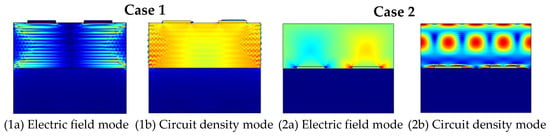 The electric field mode and current density mode of the phonon piezoelectric device for Case 1 and Case 2 are shown in Figure 14. The electric field mode and the current density mode are shear wave modes of oscillatory variation along the x-direction for Case 1. The electric field mode inside the ZnO piezoelectric membrane layer is a single-mode state, and the current density mode is a longitudinal wave mode of oscillation along the x-direction for Case 2. The electromechanical coupling coefficient K2 for different cases is shown in Figure 15. The electromechanical coupling coefficient K2 of the M12 mode, M22 mode, M21 mode, and M11 mode for Case 2 is larger than those for Case 1. The electromechanical coupling coefficient K2 of the phonon piezoelectric device in the Sezawa wave coupled mode increases and then decreases with the increase in the thickness of the ZnO piezoelectric membrane layer for Case 3 and Case 4. The electromechanical coupling coefficient K2 of (100) ZnO phonon device is larger than that of (002) ZnO phonon device. When the thickness of the (100) ZnO piezoelectric membrane layer is [400,600] nm, it has optimized electromechanical coupling coefficients for four modes.